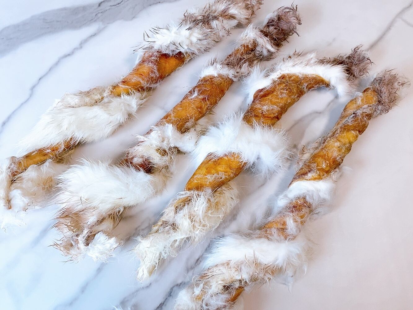 ※ うさぎの耳や毛皮には、多くの健康上の利点があり栄養価が高いですが、犬の食事に占める割合はごくわずかです。一度にたくさん与えると便秘などに繋がります。